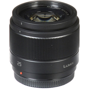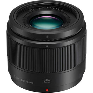 The Lumix G 25mm f/1.7 ASPH. from Panasonic is a 50mm equivalent lens featuring a bright f/1.7 maximum aperture for enhanced low-light shooting and depth of field control. A Nano Surface Coating has been applied, too, and helps to reduce flare and ghosting for increased contrast and color fidelity. Designed for Micro Four Thirds mirrorless cameras, this lens provides a 50mm equivalent focal length to represent a normal perspective. One UHR element and a pair of aspherical elements help to achieve even illumination and sharpness for consistent performance throughout the aperture range. The stepping motor delivers fast, smooth, and near-silent autofocus performance to benefit both still photograph and movie recording applications.
