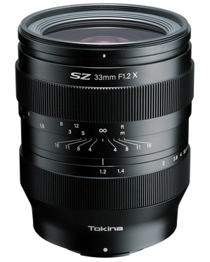 The Tokina SZ 33mm F1.2 is a fully manual optical lens featuring a standard angle of view and a super fast aperture. The lens is designed for still and video content creators with suggested genres like landscape, portrait, snap, wedding, night sky, travel for stills, and general documentary or commercial production for video. The lens is offered for FujiFulim X and Sony E APS-C size cameras. Designed for still and video content production. The most natural angle of view for wide photography scenarios. Super fast optical design for low light conditions and beautiful bokeh. The Tokina SZ 33mm F1.2 features the most natural angle of view for a human eye equal to 49.5mm which is the closest to 50°. This makes this lens useful in a wide range of genres like landscape, portrait, snap, wedding, night sky, travel for stills, and general documentary and commercial production for video. Good for time-lapse, when changing aperture during still shots (light painting) or during video shoots, when exposure adjustment in long tracking scenes is needed. 9 optical elements inside the lens body result in a super-fast aperture of f/1.2 which is good for low light shooting conditions in still photography and documentary video. A fast aperture creates a smooth and beautiful bokeh that will separate your main object from the background. The large diameter of the front element greatly contributes to minimizing the light fall-off when shooting at a wide-open aperture. The Tokina SZ 33mm F1.2 provides more than enough resolution capabilities that increase the overall cost performance of this lens. The exterior and major parts of the Tokina 33mm F1.2 are made of fine finish metal for a more sophisticated design and confidence of using the lens in different shooting conditions. The Tokina 33mm F1.2 incorporates a click-less aperture for precise and smooth exposure adjustment that is helpful in video shooting operations. The Tokina 33mm F1.2 features a depth of field & hyperfocal scale that is necessary for a manual type lens. The Tokina 33mm F1.2 performs moderate focus breathing which is a valuable feature for video shooters. Focus throw is measured in degrees and represents the amount of rotation needed to turn a lens' focus ring from its MFD (minimum focus distance) to infinity. The Tokina 33mm F1.2 performs 160° of focus throw which is long enough for a precise focusing operation.